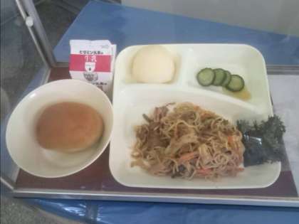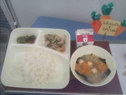 今日は豚肉とたまねぎ、ピーマンを合わせて焼いたメインのおかずに、とうふや野菜、えのきたけの入ったみそ汁、オクラのおかかいための米飯メニューでした。みそ汁の出汁は、だしこんぶとけずりぶしで本格的に引いたもので、香りがよくおいしかったです。犬やハートの形のラッキーにんじんが入っていました!