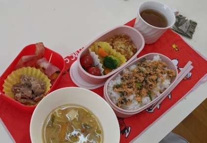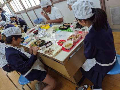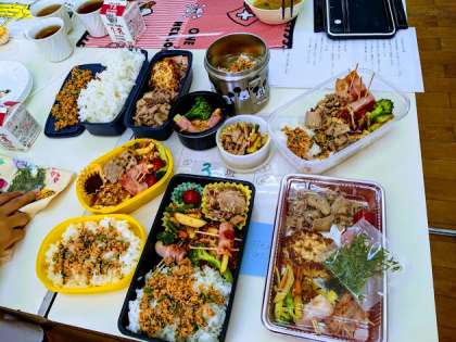 自分で持参したお弁当箱におかずをつめましたが、盛りつけはどれも素晴らしく、きれいでおいしそうなお弁当が仕上がりました!給食のご飯やさけと小松菜の混ぜご飯の具をおいしそうにトッピングしてとっても楽しいお弁当作りでした。来週は2組が調理実習をします。