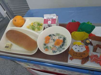 今日のメニューはホタテ貝の入ったクリームシチューでした。うまみがあって、旬のほうれん草も入って栄養満点!どのクラスも残りなしでした。秋を感じるラッキーにんじんは、きのこの形とリスの形でした。「これ、何の形やろ?」「リスちゃうか」「ほんまや!」と4年生のクラスでも話題になっていました。