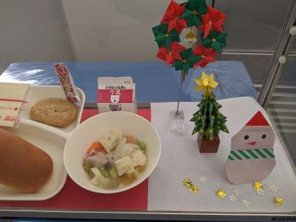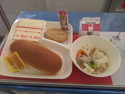 今日は手作りのとうふハンバーグでした。ツナやとうふ、調味料、でんぷんを練り合わせ、450人分を1つづつ丸めて形作り、焼き物機で焼く手間のかかるメニューでした。ていねいに調理されているのが子どもたちにも伝わっているのか、どのおかずも残りなしでした。コッペパンは焼きたてでふわふわでした。6年生の児童は「この前の調理実習で作ったハンバーグや!」と喜んで食べました。明日は旬のタラのフライと豚肉とあつあげの煮ものなどの米飯献立です。お楽しみに!