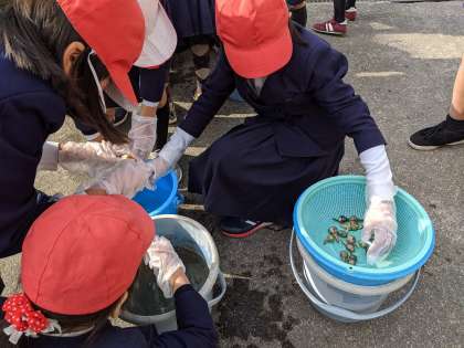 5年生が春から育ててきた吹田くわいを収穫しました。「芽が出る、めでたい」といわれ、出世や合格を願ってお正月のおせちなどにするくわいは、葉っぱの形が矢じり(弓矢の先の形)に似ていることから「勝ち草」ともいわれ、昔から武家の家紋などによく用いられてきた、とても縁起の良い植物です。大切な芽を折らないように、子どもたちはていねいに収穫しました。「家のおせちにくわいが入っていて食べたよ。」と話している児童もいました。とれた吹田くわいは、来週の調理実習で素揚げにしたくわいを味わいます!