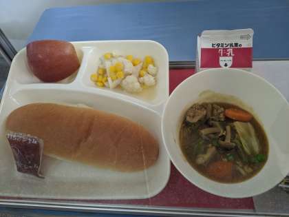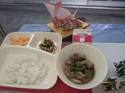 今日はお正月メニューの紅白なますと大豆を揚げてひじきや調味料とともに味付けしたご飯がすすむ「ひじき豆」でした。筑前煮は穴が開いて「先の見通しがよい」とおせちに入っているれんこんがシャキシャキしていました。昨日のカリフラワーのメニューも旬の味でおいしかったです。野菜のおかずも子どもたちは残さずに食べてくれるようになり、4月よりも一段と成長を感じます。