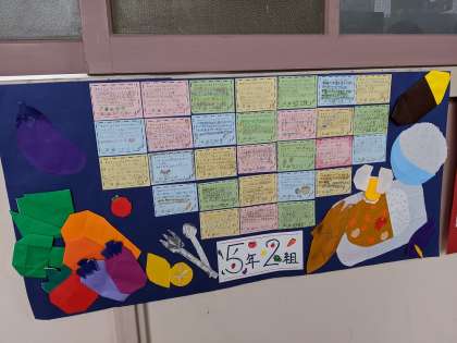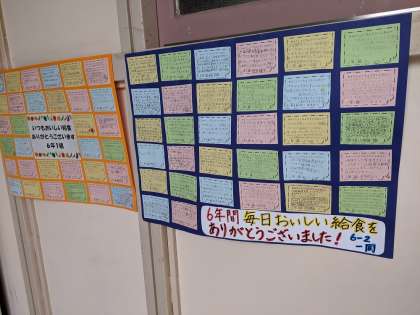 「毎日おいしい給食をありがとうございます。一度も残したことがありません。」や「私はちらしずしやまぐろのオーロラ煮が大好きです。また出るのが楽しみです。」「ラッキーにんじんがかわいくて大好きです!」など、思い思いの文章をていねいに綴っています。6年生は「6年間ありがとうございます。」の言葉も。中には切り紙のところに秘密の暗号を入れた、アイデアたっぷりのクラスもありました!校内のあちこちに掲示していますので、ぜひご覧ください。