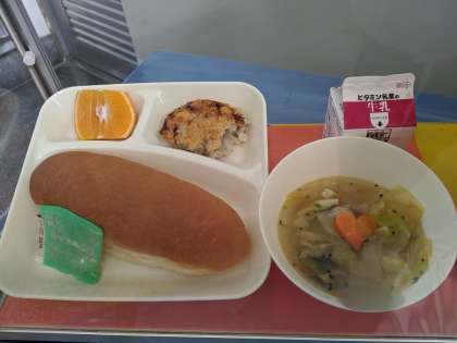 今日はふわふわのコッペパンに押し麦のグラタンでした。麦は食物繊維がたっぷりで、お通じにもよいので、朝ごはんにもおすすめです。いよかんはジューシーで、食べやすくカットされていました。しかもスープにはハート型のラッキーにんじんが♡楽しい給食時間に子どもたちは残さずきれいに食べてくれました!先週の「鶏ごぼうご飯」も大好評。れんこんのシャキシャキした歯ごたえがよい焼き物もありました。