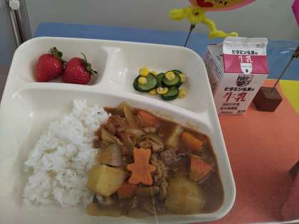 今日は大人気のカレーライスにいちごがついて、春らしいメニュー。カレーにはクマの形のラッキーにんじんが入っていました。子どもたちは大喜びでした。