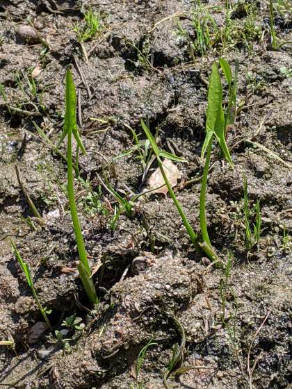 昨年度5年生の児童が掘り残したなにわの伝統野菜「吹田くわい」が芽吹いてきました。葉っぱが弓矢のような形「矢じりがた」になってきました。