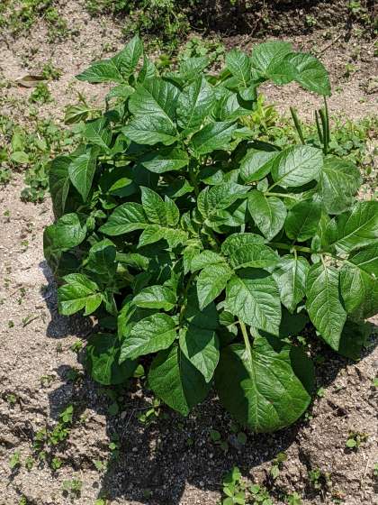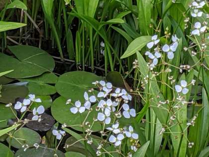 畑ではじゃがいもやてんまな(おおさかしろな)も元気に育ち、校門前の池にはオモダカの白い花の下、メダカが元気に泳ぎ回っていました。