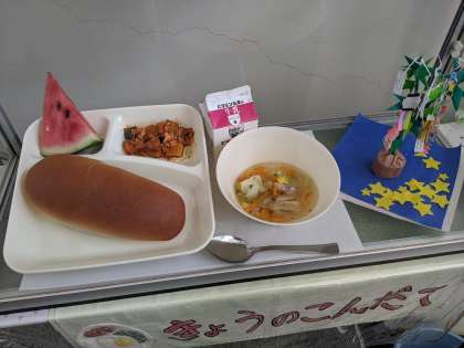 大きなスイカみたいな夏野菜「とうがん」の煮ものが出ました。透明感があって夏らしい大人の味に、子どもたちは初めてで戸惑う子もいましたが、きちんとおだしをとって煮ているおいしさがわかったのか、おかわりもたくさんしてくれて残りはほとんどなしでした。デザートに年1回だけ出るスイカもあり、梅雨のうっとうしい時期ですが、季節を感じてくれたらいいなとおもっています。