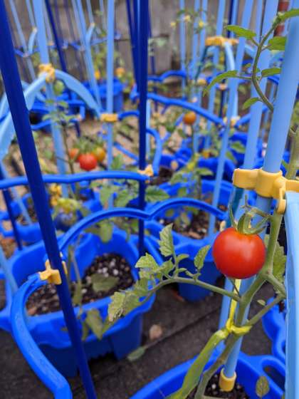 学習園では、太陽をあびて真っ赤に実った2年生のトマトがニコニコ笑顔で並んでいます。