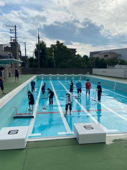 来週のプール開きに向けて、プール清掃を行いました。プールサイドは事前に管理作業員さんが高圧洗浄機を使いきれいにしてくださっていました。今日は、プールの中の汚れをデッキブラシや水切りを使って取っていきました。