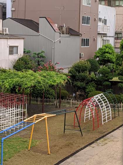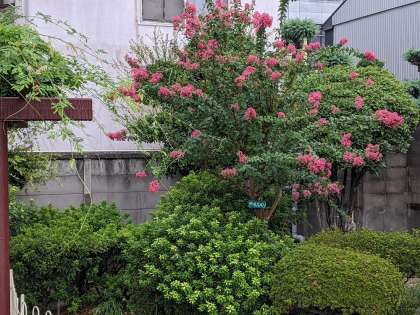 校庭では千日紅(サルスベリ)の花がきれいに咲き、雨の中体育館で運動会の練習をがんばっている子どもたちの様子を見守っているようでした。
