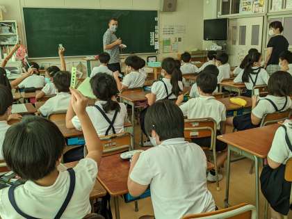 運動会の練習だけでなく他の学習もしっかりがんばっています。今日はマーク先生が来てくださり、3年生、4年生のクラスで英語活動の授業がありました。授業の導入の部分、子どもたちは「What Color?」や「What Is This?」の質問に色の名前や物の名前を元気よく答えたり、赤や紫の色のものを指さしたり、要領のよい子は色鉛筆を用意して言われた色を上げ、楽しそうに学習していました。