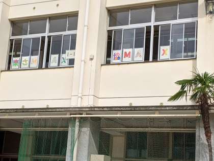 校舎の窓には運動会のスローガンが掲げられ、いよいよ練習にも気合いが入ります!