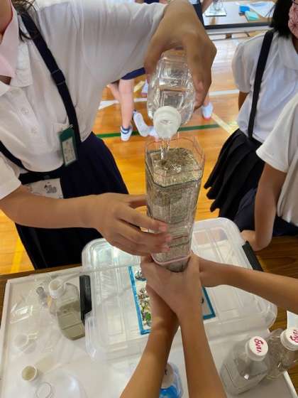 続いて、グループに分かれて実験を体験できました。机の上には、手作りの実験道具がたくさん。まず、砂を使ったろ過を体験しました。柴島浄水場と同じ仕組みで砂を洗い、泥水を砂に注いでいくと、不思議! すごい! 泥水が透明できれいな水に変わったじゃありませんか。子どもたちは大喜びです。続いて、水についたにおいをとる実験を粒状活性炭を使って行いました。ろ過しただけでは、いやなにおいが残っている水に色もつけて粒状活性炭に入れてみると・・・においも色もとれたきれいな水が集められました。