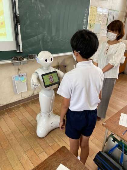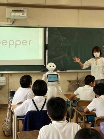 5年生の教室にPepperがやってきました。今日は、Pepperをゲストティーチャーにお迎えし、環境学習を学びました。