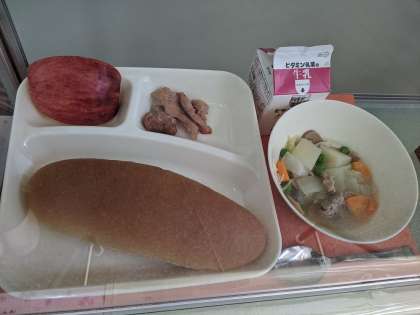 運動会の後に給食があり、午後もしっかり学習をしました。今日のメニューは、黒糖パンにグリルしたチキン、じゃがいもの入ったスープ煮、りんごもついていました。1年生と2年生のりんごは歯が生え変わる時期で噛みきりにくいので皮をすべて剥いて提供してくださいました。今日は中秋の名月の日。がんばった子どもたち、今夜はまん丸い十五夜の月を見て、すやすやと眠ることでしょう。