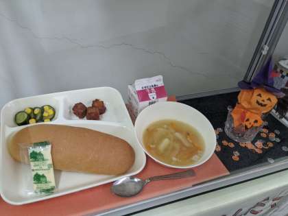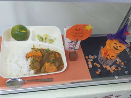 10月になり、ハロウィンのネコやコウモリのラッキーにんじんがカレーライスに入っていました。あいにくの雨で1年生はお弁当を食べましたが、大好きなカレーにラッキーにんじんが入って高学年の児童も大喜びでした。