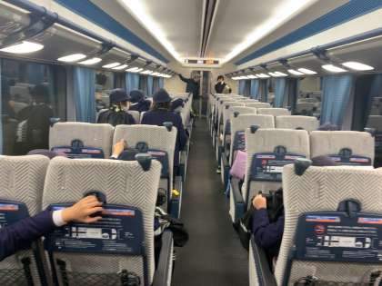 乗車マナーを守って、静かに過ごしています。志摩磯部に着いたら、楽しみいっぱいのスペイン村です。