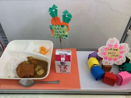 給食室の調理員さんが、1年生の入学や進級へのお祝いの気持ちを込めて、かわいい折り紙のランドセルで飾りつけをしてくださっていました。