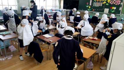 新年度の給食がはじまりました。はじめての給食にドキドキの1年生。上手にエプロンを着て、給食の準備は万端!給食が配られるまで、自分の席で静かに待っていることができました。カレーを食べて、「おいしい!」と幸せそうな顔をたくさん見せてくれました。これからも毎日しっかり食べてたくましく成長してほしいですね。