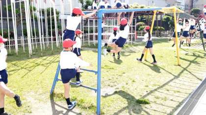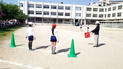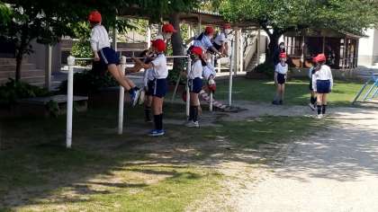 3年生が50m走の計測をしました。待ち時間は、鉄棒や遊具で体幹が鍛えられました。