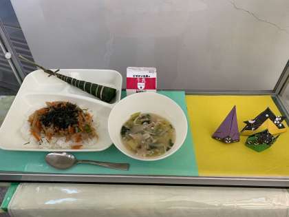 今日の給食は、きんぴらちらし、すまし汁、ちまき、牛乳でした。