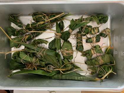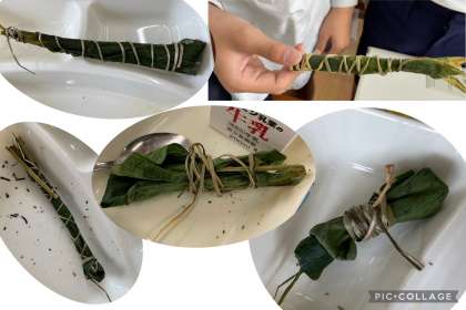 6年生は、食べ終わったちまきの笹の葉を、まとめてくれました。とっても小さくまとめたり、バットやリボンをイメージしてみたり。中には、まだちまきが中に入っているかのような結び方をした子もいました。個性豊かな笹の葉たち、楽しませてもらいました。
