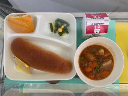 ビーフシチューは、小麦粉とサラダ油で作った手作りルーを使用しています。今日はビーフシチューに、ちょうちょのラッキーにんじんが入っていました。ラッキーにんじんが当たった子は、とても嬉しそうに、最後に食べるためにラッキーにんじんを横によけていました。