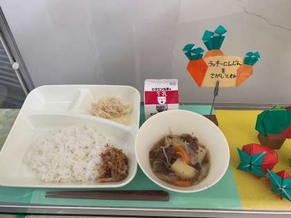 今日の給食は、肉じゃが、もやしのゆずの香あえ、ごまかかいため、ごはん、牛乳でした。