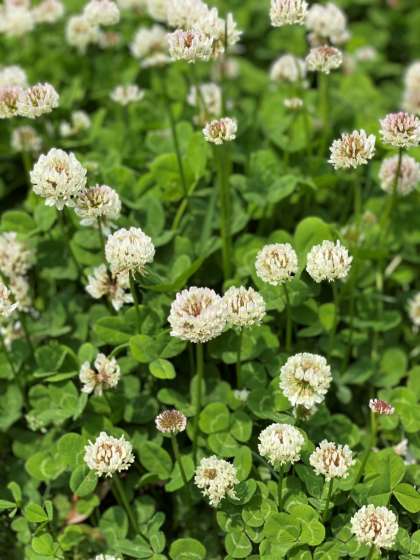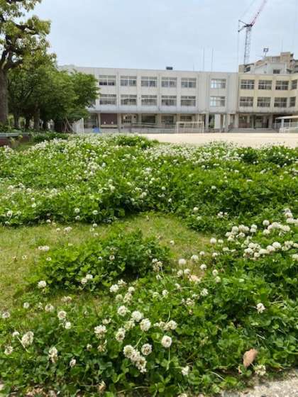 校庭の芝生の上にシロツメクサが生い茂っています。さながら「クローバーの森」です。ふかふかしていて気持ちいいです。四つ葉のクローバーは見つけられたかな?