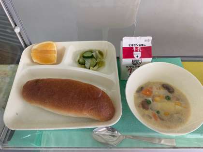 今日の給食は、コーンクリームシチュー、キャベツときゅうりのサラダ、かわちばんかん、レーズンパン、牛乳でした。