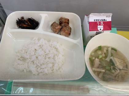 今日の給食は、さけのごまみそ焼き、五目汁、ひじきのいため煮、ごはん、牛乳でした。