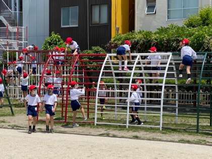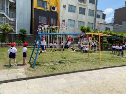 ジャングルジムなど高い所まで登れる遊具は、慎重に慎重に登り、降りていきます。「雲梯の端から端まで行けたよ。」と教えてくれた子もいましたよ。