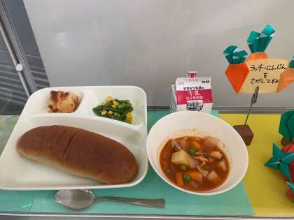 今日の給食は、ケチャップ煮、さんどまめとコーンのソテー、りんごのクラフティ、黒糖パン、牛乳でした。