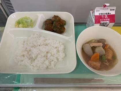 今日の給食は、ちくわのいそべあげ、あつあげとさといもの煮もの、あっさりキャベツ、ごはん、牛乳でした。