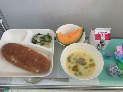 今日の給食は、かぼちゃのクリームシチュー、ミックス海そうのサラダ、クインシーメロン、おさつパン、牛乳でした。