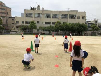 1年生がアサガオの間引きをしました。残したアサガオは二つです。いい花が咲きますように。体育科の学習では、かけっこをしました。みんな一生懸命走りました。