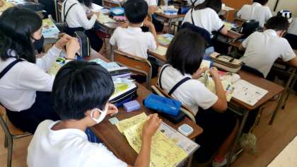 5年生は、家庭科で裁縫の学習です。玉結び、玉止め、並縫いの練習。「あ〜難しい。」「先生、これであってますか?」悪戦苦闘の5年生でした。
