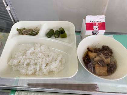 今日の給食は、すき焼き煮、オクラのかつお梅風味、もやしとピーマンのごまいため、ごはん、牛乳でした。
