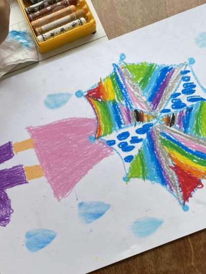 1年生が図工科でカラフルな傘を描きました。クレパスでしっかりと塗り込まれています。こんな傘なら、雨の日も楽しくなりますね。
