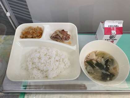 今日の給食は、豚肉の甘辛焼き、すまし汁、切干大根のいため煮、ごはん、牛乳でした。
