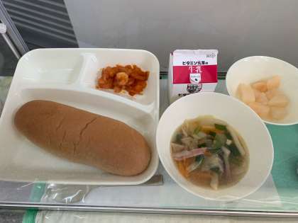 今日の給食は、えびのチリソース、中華スープ、和なし(カット缶)、黒糖パン、牛乳でした。