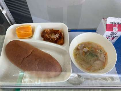 今日の給食は、かぼちゃのミートグラタン、スープ、オレンジ、黒糖パン、牛乳でした。