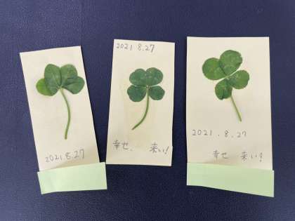 運動場の芝生の中から幸せのクローバーを発見!!みんなの願いがいっぱいつまったカードが仕上がりました。