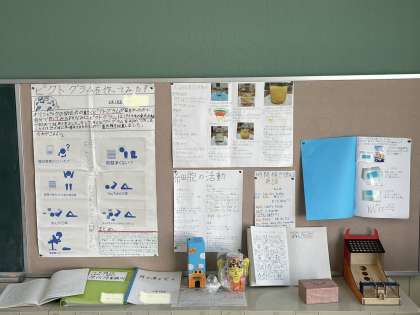 教室の後ろには、夏休みの自由研究や自主勉強、工作などがあふれています。夏休みのがんばりがよくわかります。素晴らしいですね。