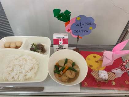 今日の給食は、一口がんもとさといものみそ煮、牛肉と野菜のいためもの、みたらしだんご、ごはん、牛乳でした。
