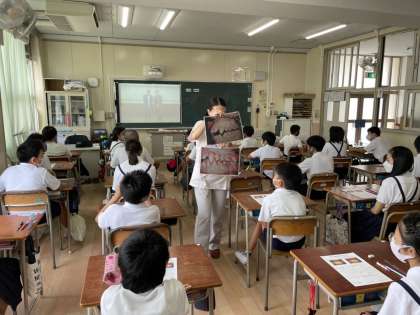 野生のサルと動物園のサルの歯の違いを写真で見たり、歯周病について学習したりしました。