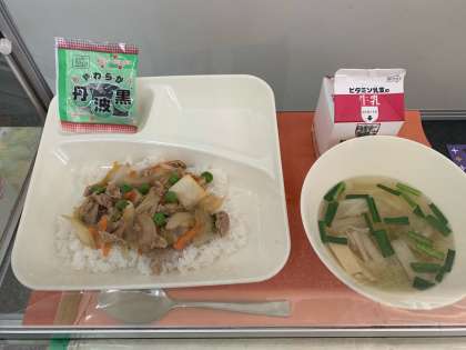 今日の給食は、ピリ辛丼、中華スープ、ソフト黒豆、牛乳でした。
