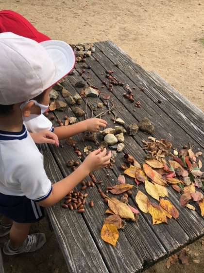 汗だくになりながら、新しくできた遊具やドングリ拾い、クラス遊びなどをして、みんなで楽しく仲よく活動しました。おいしいお弁当をありがとうございました。