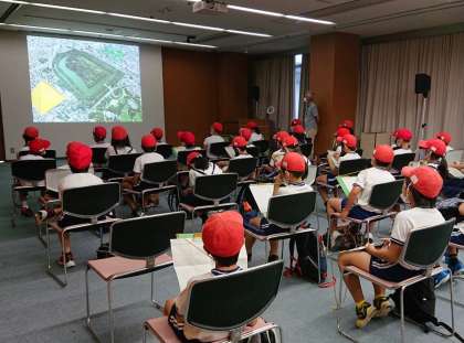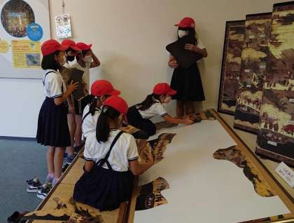 子ども達は、目の前の仁徳天皇陵古墳の大きさに圧倒されていました。その後は、「堺市博物館」で古墳群や堺市の歴史についての説明を聞いたり、クイズに答えたりしながら見学しました。